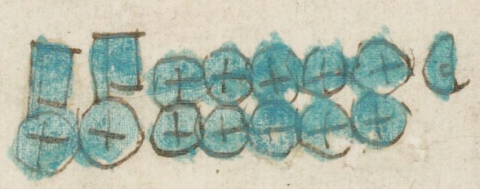 This simplex glyph for the noun "peso" (a Spanish coin) is combined with the notation for fifty and a half (50.5). The numbering involves two flags each symbolizing twenty (tecpantli), then ten ones, and a half peso. The flags are the standard rectangle on a short pole, in this case flying to the viewer's right. The coins have a cross (+) on them. Everything is painted a turquoise blue.