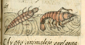 This iconographic example, featuring a crayfish (acocilin), is included in this digital collection for the purpose of making comparisons with related hieroglyphs. The term selected for this example comes from the text near the image in the Digital Florentine Codex. There is no gloss, per se. This example shows a semi-bird’s eye view of a crayfish, facing toward the viewer’s right. It is pink in color, and the carapace is segmented so that the body and tail can bend. Tucked inside the tail appears to be a cluster of eggs. The tail has a fan (uropod) at the end, too. Six legs are visible, all with pincers, and the two farthest forward are held upward, with the pincers near the head. The head comes to a point at the rostrum. It has two eyes on top and antennae on both sides of the point. This animal is placed in a watery landscape, where there are lines of current and a visible whirlpool. A landscape placement suggests European artistic influence, but the prevalence of whirlpools seems Mesoamerican.