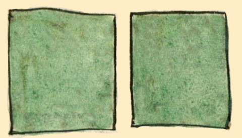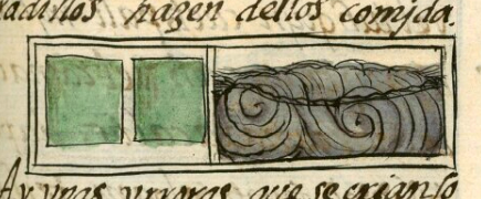 This iconographic example, featuring blue-green algae (acuitlatl), is included in this digital collection for the purpose of making comparisons with related hieroglyphs. The term selected for this example comes from the text near the image in the Digital Florentine Codex. There is no gloss, per se. This example shows two green rectangles. The text explains that this is a blue algae that is gathered from the surface of the lake, formed into cakes that are cooked over coals, and then eaten as a tostada. The text also gives other names for this algae, such as tecuitlatl, azoquitl, and amomoxtli. Interestingly, this is one of many examples where green paint is used to show a blue material, showing the overlap in Nahua thinking about the colors of blue and green. The contextualizing image shows, to the right of the green rectangles, a body of water painted gray. It has two whirlpools or swirling lines of current (movement). It also has a curving, floating layer of algae that runs largely horizontal against the water. Presumably, this algae floats on the top, but the water is not shown in a cross-section view.