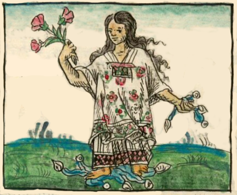 This iconographic example, featuring what Western society refers to as a prostitute (and, in Nahuatl, ahuiani, ahuilnenqui, or cihuatlahueliloqui), is included in this digital collection for the purpose of making comparisons with related hieroglyphs. The term selected for this example comes from two pages prior to the image in the Digital Florentine Codex. There is no gloss, per se. This example shows a frontal view of a standing woman, wearing a flowery huipilli with an elaborate lower border design and an elaborate chest patch. Her skirt (cueitl), likewise, has an elaborate pattern at the bottom, in red and black checks. She is barefooted, standing on a group of short streams of water (atl), which seem to play a phonetic role here, indicating that the terms ahuiani and ahuilnenqui start with a-. The water is unchanged from earlier hieroglyphic writing, such as appears in the Codex Mendoza. In the woman’s left hand she also holds three short streams of water with their attendant lines of current and shells and droplets at their tips. In her right hand, she holds a bouquet of three green stems with leaves and three tri-petal flowers in red. Flowers are a reference to fertility [see Lori Boornazian Diel, Aztec Codices (2020), 133] and the womb, among other themes [see James Maffie, Aztec Philosophy (2014), 232]. But Peterson and Terraciano (2019, 193) believe that in this particular manuscript, the tlacuilos have used the “multivalent” flowers to convey “seduction and sexual excess.”