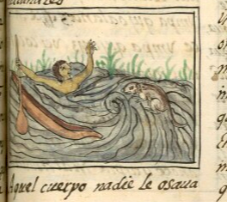 This iconographic example features a mythical water animal (ahuitzotl) that hunts people, a reversal of the usual human who hunts animals. It is included in this digital collection for the purpose of making comparisons with related hieroglyphs. The term selected for this example comes from the text near the image in the Digital Florentine Codex. There is no gloss, per se. This example shows a man in profile, facing right, in deep water, and holding onto a paddle. He has fallen out of his canoe. His mouth is open, and his left arm is raised as though he is crying for help. On the right side of the scene is the ahuitzotl, a brown, four-legged animal with a long tail. It may be an otter, nutria, or perhaps an amphibious marsupial. This animal, which looks relatively benign and calm here, was believed to be able to reach up from under the water and pull humans down, drowning them, by using a hand attached to a long tail. The text on 71r describes the terrible fate of the body of someone killed by the ahuitzotl. The text, in fact, expands over several pages, providing more information about the corpse, and another scene of the ahuitzotl hunting humans appears on folio 72v. On 73r, another story tells of a woman who captured an ahuitzotl, put it in a water jug (comitl), and went to show it to the lords, who perceived it to be a divine force (teotl). The water here looks stirred up and treacherous, which is also described in the text. The swirling whirlpool here is a regular feature of bodies of water painted in a Nahua style. The grass growing along the top of the water (presumably a shore), however, suggests European artistic influence that pushed for a landscape setting.