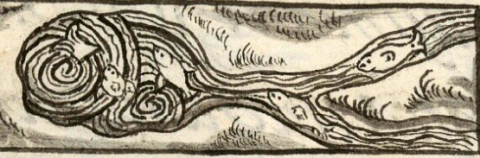 This iconographic example, featuring a natural spring (ameyalli), is included in this digital collection for the purpose of making comparisons with related hieroglyphs. The term selected for this example comes from the text near the image in the Digital Florentine Codex. There is no gloss, per se. This example shows a spring with two whirlpools, swirling around and flowing off to the right, branching into two streams with a Y-shape and full of wavy lines that suggest current and movement. This spring has at least five fish. Another ameyalli (on folio 226 recto) simply has three whirlpools, no streams, and no fish. It is somewhat more glyph-like.