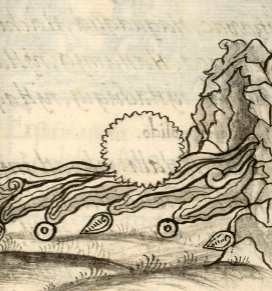 This digital collection has neither a glyph for mochitl or amochitl so far (December 2025), but this example of a late-evolution compound glyph is a valuable contribution. The water is more of a river than the old hieroglyphs or elements for atl, but it does have the usual lines of current, the droplets or chalchihuitl beads, and the cilin shells splashing off. More of a late evolution is the element that is “tin,” especially if it is a saw blade. It is reminiscent of the tepozahuatl metal spur identified by Juan José Batalla in the glyph for Mazahuatl (MH517v, see below). If so, this suggests European technological influence. But it may simply be a reference to the shine on the metal. The cave in this scene is a landscape feature that suggests European artistic influence. Other, earlier ways of drawing caves appear below.