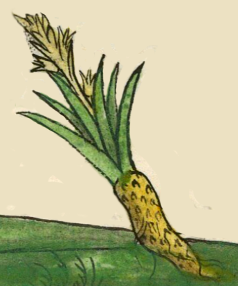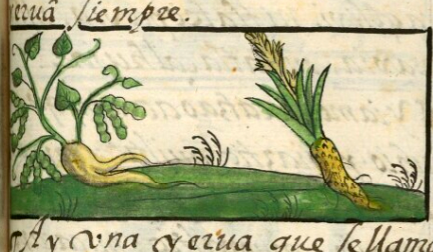 Two examples of amolli tubers appear already in this digital collection, both of them hieroglyphs. One is from the place name Huitzamollan, and the other is a personal name, Amol (apocopated). The greenery on these tubers is not significantly different from this iconographic example. This is true, too, of the texturing and yellow-tan coloring on the place name’s root. One other interesting example of amolli is what the tlacuilo calls “amolli Caxtillan,” meaning Castile soap.