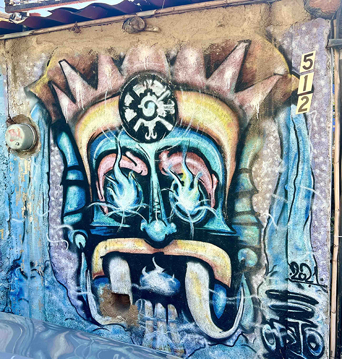 This contemporary (2021) Oaxacan wall painting found in Jalatlaco, Oaxaca, provides evidence of the enduring appreciation for pre-contact divine forces, such as Tlaloc, with his fire and rain attributes. Photograph by Stephanie Wood, 23 January 2026.