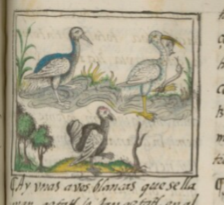 This iconographic example, featuring a great blue heron (axoquen), is included in this digital collection for the purpose of making comparisons with related hieroglyphs. The term selected for this example comes from the Nahuatl text near the image in the Digital Florentine Codex. There is no gloss, per se. This example shows a bird in profile, facing the viewer’s right, and standing only on its right leg. The left leg is raised as though it might be walking. The bird is largely gray and white, but it is blue from the back of its head down to near where the tail feathers begin. It has some shading that gives it a three-dimensionality, which shows European artistic influence.