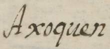 Axoquen is also the name of an agricultural tool that looks something like a shovel, but it has a handle that curves and has an animal head at the upper end. Maybe surprisingly, the animal head does not resemble a heron’s head. So, in this digital collection, at this point (October 2025), the only glyphs of axoquen are of these tools. Interestingly, all three examples are personal names of men, and they all come from the Martícula de Huexotzinco. Most men in that area were probably farmers.