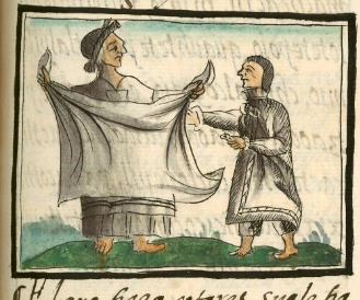 This iconographic example, featuring a cloak or blanket made of coarse fiber (ayatl), is included in this digital collection for the purpose of making comparisons with related hieroglyphs. The term selected for this example comes from text near the image in the Digital Florentine Codex. There is no gloss, per se. This example shows a woman holding a white, rectangular cloth by its top two corners. In the contextualizing image, a potential buyer on her right is a man wearing a cloak. The seller of ayatl is an ayanamacac, which also appears in the Nahuatl text. Both the cloth and the woman’s clothing have shading, which shows a European artistic influence. This is true, too, of the blue sky at the top and the green ground at the bottom of the “scene,” which also involve European influences. With regard to another matter, Anderson and Dibble use male pronouns, but the seller is clearly a woman. The description of the “capes” explains that they can be thick or thin, tight or loosely woven. Nettles and flowers can be woven into these cloths.