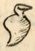 This black-line drawing of the compound glyph for the personal name Ayollo (literally “Water-Heart”) is attested here as a man’s name. The glyph shows a heart (yollotl) with a curling top that is a shape reminiscent of the end of a stone. Below this are two horizontal stripes, and then an oval-shaped black center for the heart. This black oval may refer to rubber (olli) and serve as a phonetic complement for yollotl. Most of the heart, however, is white. Five rows of wavy horizontal lines, alternating dark and lighter, appear behind the heart and below it, as though the heart is on the water.
