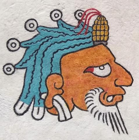 This is a twenty-first century compound Nahuatl hieroglyph for the personal surname Becerra. It consists of three phonetic elements. First is the face of a wrinkled old man (huehue) painted orange or terracotta. The face is shown in profile view, facing to the right. One of his (few) teeth is protruding. He has a white beard, also a sign of his age. On top of his forehead is a corncob (centli) from which a turquoise blue stream of water (atl) emanates all the way to the back of the head of the old man, spilling at the bottom left of it. The water has wavy lines of current (suggesting movement) and five short splashes with a white droplet or bead at the tip of each one. These phonetic elements (hue + cen + a) combine into a phonographic rendition of the surname Becerra. The glyph was made on amate paper and it was colored with dyes made from cochineal, Mayan blue (made by the master artisan Luis May Ku), zacatlaxcalli, gypsum, and black acrylic ink. With the exception of the acrylic ink, all of these materials were used as colorants in pre-Hispanic codices.