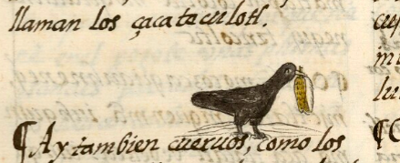 This iconographic example, featuring a raven (cacalotl), is included in this digital collection for the purpose of making comparisons with related hieroglyphs. The term selected for this example comes from the text near the image in the Digital Florentine Codex. There is no gloss, per se. The preference for the translation of raven over crow comes from the ornithologist Eugene S. Hunn. This example shows a raven in profile, facing the viewer’s right. All its feathers are black. It has what appears to be a seed pod, partially unhusked, in its beak. This resembles a corn cob, but if that is indeed what it is, it is a small one, given its proportional size. The raven stands on some ground with a slight rise to it. This grounding shows European artistic influence.