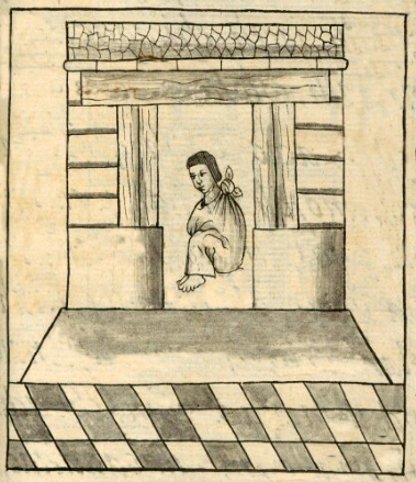 This iconographic example, featuring a black and white sketch of the house of a steward (calpixcacalli), is included in this digital collection for the purpose of making comparisons with related hieroglyphs. The term selected for this example comes from the text near the image in the Digital Florentine Codex. There is no gloss, per se. This example shows a frontal view of a building with an open door. Sitting inside is a Nahua man in profile, facing left. He has a blanket (perhaps a tilmatli, or tilmahtli with the glottal stop) wrapped around him, tied behind his neck. His feet are bare. He may be the steward (calpixqui, steward or tax collection) to which the building refers. The foreground of the building consists of alternating light and dark stones. The facade of the building shows what may be plain stucco almost a meter up from the bottom. Above that seem to be horizontal planks. The entryway is reinforced with what are likely wooden beams. This sketch includes shading, giving the blanket and the building some three-dimensionality, a European artistic trait.