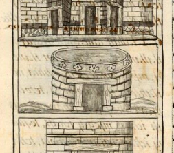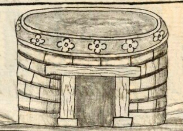This iconographic example, featuring a black and white sketch of round house (calyahualli), is included in this digital collection for the purpose of making comparisons with related hieroglyphs. The term selected for this example comes from the text near the image in the Digital Florentine Codex. There is no gloss, per se. This example shows a house made primarily of adobe bricks. It is completely round, with no corners. A flower motif runs along the top of the building, just below the roof. The doorway, framed with wooden beams, is open.