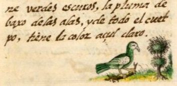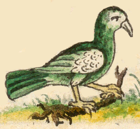 This iconographic example, featuring a bird called the red-legged honeycreeper (chalchiuhtototl, literally, in Nahuatl, green-stone or jadeite bird), is included in this digital collection for the purpose of making comparisons with related hieroglyphs. The term selected for this example comes from the text near the image the Digital Florentine Codex. There is no gloss, per se. This example shows a predominantly green bird with a white face and some white on its wing, standing and facing toward the viewer’s right. It is standing on a wooden twig, and this is placed in a landscape setting, which shows European artistic influence.
