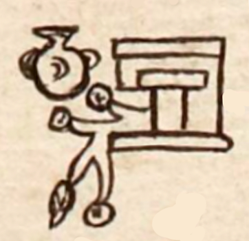 This compound Nahuatl hieroglyph is a black-line drawing of the personal name Chantictzin (apparently a reference to the female divine force associated with the hearth, Chantico, “In the Home”), attested here as a man’s name. The compound has three elements, two of them seemingly phonetic indicators. First is the sign for chantli (home), which looks just like calli (house). The water (atl) seems to be a phonetic complement, clarifying that the first syllable includes the vowel sound “a.” The -co suffix to the name (without the reverential -tzin ending) would come from the pottery jug (comitl).