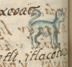 This iconographic example, featuring a dog (chichi), is included in this digital collection for the purpose of making comparisons with related hieroglyphs. The term selected for this example comes from the text near the image in the Digital Florentine Codex. There is no gloss, per se. This example shows a standing dog in profile, facing the viewer’s right. Its coat is shaggy, and it is painted a turquoise blue. Its tail is raised up and curving over at the tip.