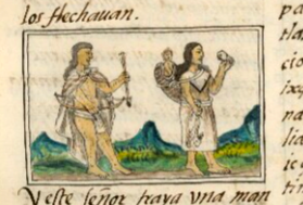 This iconographic example, featuring a Chichimec man (Chichimecatl, oquichtli)), is included in this digital collection for the purpose of making comparisons with related hieroglyphs. The term selected for this example comes from the Nahuatl text on the preceding page of the image in the Digital Florentine Codex. There is no gloss, per se. This example shows a man walking (movement) toward the viewer’s right. He has long hair. He is wearing a hide cape, which is tied over his chest. He also wears a loincloth. Both garments have some shading, creating a three-dimensionality. This was a practice learned from the Spanish colonizers. The companion text adds that the skin of the cape might come from a linx, ocelotl, wolf, puma, or squirrel. The man holds a bow under his right arm and an arrow (point down) in his left hand. The weapons are a tan or light brown color, suggesting they are made of wood, in part. His presentation on a green and blue landscape also shows European artistic influence.