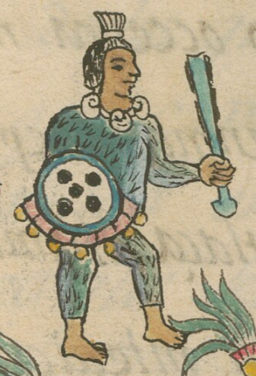 This iconographic example, featuring a shell necklace (chipolcozcatl), is included in this digital collection for the purpose of making potential comparisons with related hieroglyphs. The term selected for this example comes from the keywords chosen by the team behind the Digital Florentine Codex. This contextualizing image shows a necklace worn by a warrior (yaoquizqui), who also carries a shield (chimalli), an obsidian-blade embedded club (macuahuitl), and his hairstyle is a temillotl--all these terms come from the keywording of the DFC, not from glosses. The shells and their tie are all white. The shells have quite a swirl in them, and swirls were greatly valued. The shell may be from a snail or some type of marine shell. Several dictionaries have latched onto the translation of seashell necklace.