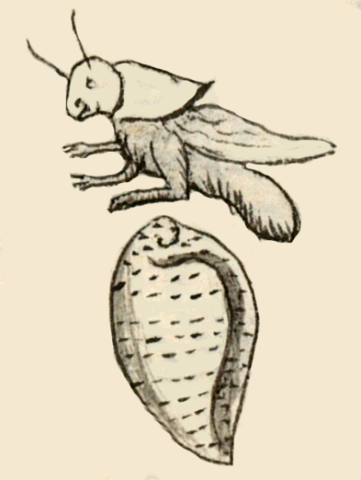 This compound hieroglyph features a black-line drawing of a type of gastropod shell called the chipolli (and alternatively, chipolin). The term selected for this example comes from the text near the image in the Digital Florentine Codex. There is no gloss, per se. This compound features a turbinate shell with the swirl at the top and a series of horizontal lines of dashes. The opening in the shell runs vertically along the right side, and it is shaded, giving it a three-dimensionality (a European artistic trait). A grasshopper (chapolin) hovers in the air above this shell. It is shown in profile, facing left, with its legs extended in front of it. This insect seems to serve as a phonetic indicator for the name of the shell, given that chipolli or chipolin sounds something like chapolin, a near homophone.
