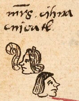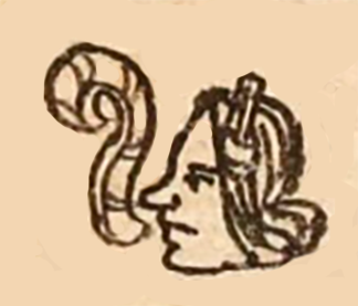 This compound Nahuatl hieroglyph is a black-line drawing of the personal name Cihuacuicatl (“Woman Song”). It shows the head of an adult woman (cihuatl) wearing the neaxtlahualli or axtlahuilli hairstyle. She is shown in profile, facing left. Curling out of her mouth is a segmented volute representing song (cuicatl). This is apparently a name that refers to “Woman-Song” or the “Song of Women.” Another nearly identical glyph for Cihuacuicatl appears on folio 36 recto.