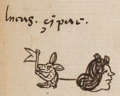 This compound Nahuatl hieroglyph is a black-line drawing of the personal name Cipac (“Crocodile”), attested here as a man’s name. It has two elements. On the left is a jack rabbit or hare (citli, or cihtli, with the glottal stop). It has long ears, and its coat is speckled. This animal provides the phonetic start to the name, Ci-. The animal is holding onto a post with a swallowtail flag flying to the left. The flag (pamitl) provides the phonetic -pa- that forms the start of the second syllable of the name (-pac). Thus, this compound provides a fully phonetic spelling for Cipac, which is a name for an entirely different animal compared to what is pictured. This compound also includes the head of a cihuatl in place of the usual man’s head, the man who is being named (“Lucas Cipac”). Having the woman’s head here seems to intend yet another phonetic complement for the Ci- start to the name. In contrast to this compound hieroglyph, the Cipac glyph on f. 27r does not include the woman’s head.