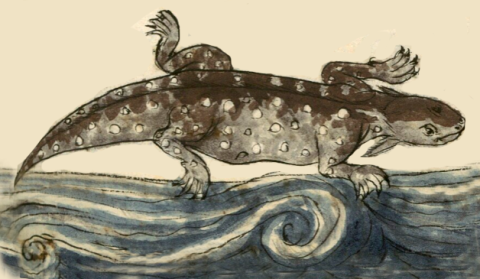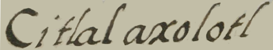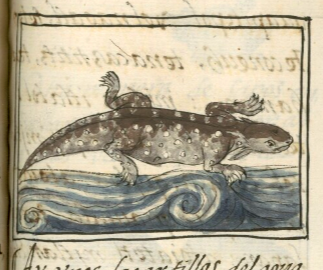 This iconographic example, featuring a star-covered axolotl (a type of salamander), is included in this digital collection for the purpose of making comparisons with related hieroglyphs. The term selected for this example comes from the text near the image in the Digital Florentine Codex. There is no gloss, per se. This example shows a bird’s eye view of this citlalaxolotl. It has a gray and brown body, with most of the brown coloring in patches on the animal’s back. The feet are webbed, and the gills are external. All feet seem to have only four digits, but the back ones should have five. The entire surface of the animal’s skin has small circular white spots, which contribute to the citlalin (star) reading of the name.