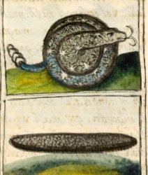 This iconographic example, featuring a type of rattlesnake (citlalcoatl), is included in this digital collection for the purpose of making comparisons with related hieroglyphs. The term selected for this example comes from the text near the image in the Digital Florentine Codex. There is no gloss, per se. This example shows a fully spiraled snake with European-type pointed stars on its skin, a protruding bifurcated tongue, and a detailed rattler. The landscape setting for this serpent also shows European artistic influence.
