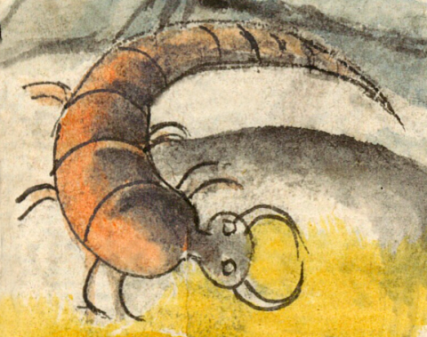 This iconographic example, supposedly featuring a scorpion (colotl), is included in this digital collection for the purpose of making comparisons with related hieroglyphs. The term selected for this example comes from the text on the page previous to the image (f. 92r) in the Digital Florentine Codex. There is no gloss, per se. Scorpions usually have a tail curving at the back with a stinger on the end. Scorpions also have two claw-like pincers at the front. Perhaps the artist was not really familiar with scorpions. This creature looks more like those called petlazolcoatl (centipedes) on the previous page. The contextualizing image shows two men wearing three-dimensional cloaks and loincloths. One is holding the leg of the other, who has been stung by a scorpion. The incident is set in a landscape, another indication of European artistic influence, and yet there is a peak in the distance, something that would have captured the Nahua artist’s attention.