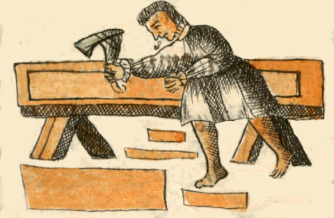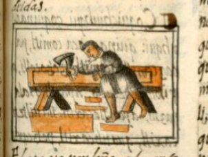 This iconographic example, featuring the verb “to sell wood” (cuauhnanamaca), is included in this digital collection for the purpose of making comparisons with related hieroglyphs. The term selected for this example comes from the text near the image in the Digital Florentine Codex. There is no gloss, per se. This example shows a fully clothed man in a ¾ view, facing left. His clothing is shaded, giving it a three-dimensionality, a European artistic tradition. A small speech scroll emitting from his mouth suggests some degree of status for having a voice. Being fully dressed in a European style also supports this. The wood seller holds an axe in his right hand. Next to him is a work table, and on the ground near his feet are four planks of varying sizes that he has made and is likely selling, according to the Nahuatl text. The reduplication in the verb (-nana-) does not seem necessary, but perhaps the intention is to convey a quantity of wood, and the visuals offer several pieces of varying size. The verb nanamaca, to sell water, does not seem relevant here.