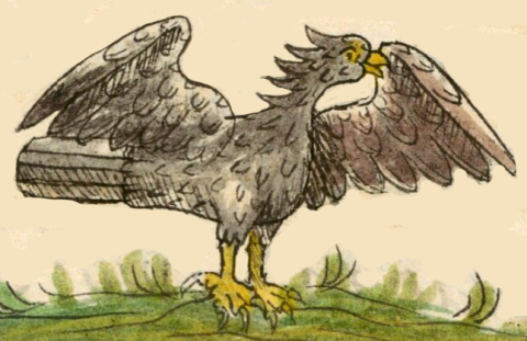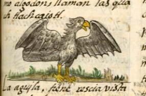 This iconographic example, featuring an eagle (cuauhtli), is included in this digital collection for the purpose of making comparisons with related hieroglyphs. The term selected for this example comes from the Nahuatl text near the image the Digital Florentine Codex. There is no gloss, per se. This example shows an eagle with its wing spread, body facing forward (frontal), but head turned to the right. Its wings are gray and brown, its eye, beak, legs and feet are yellow. It is perched on a grassy knoll. The addition of this landscape suggests European artistic influence. Hatch marks create shading that gives the bird some three-dimensionality.