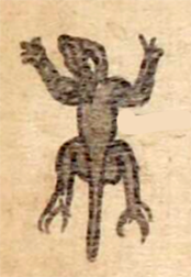 This simplex Nahuatl hieroglyph is a black-line drawing of the personal name Cuetzpal (“Lizard,” attested here as a man’s name). This is a day sign in the 260-day religious divinatory calendar. The lack of a companion number to the day name may be owing to the tlacuilo's desire to disguise that this was a calendrical name, given the colonial clergy's opposition. If this manuscript is as early as many believe, it would probably not be likely that this was a case of forgetting the iconography. Serious events in 1539 may have made Nahua tlacuilos more cautious when writing and painting about aspects of their faith. See Patricia Lopes Don for information about the Inquisition case against don Carlos Ometochtli, a Chichimecatecuhtli executed in late 1539, in Bonfires of Culture, 2010. Bradley Benton (The Lords of Tetzcoco, 2017, 46) also writes that the case “demonstrates that blatant disregard for Christianity had serious consequences.” This cuetzpalin is shown in a bird’s eye view, or else as climbing up a wall. Another very similar example of this glyph also appears on folio 32 verso. This lizard has a dark color, which may be a complement for the -pal- syllable (from palli, black).