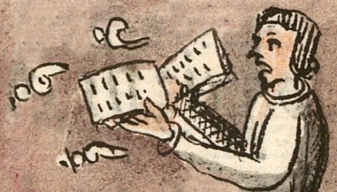 This iconographic example, featuring a singer (cuicani) holding a book of music, is included in this digital collection for the purpose of making comparisons with related hieroglyphs. The term selected for this example comes from the text on the same page in the Digital Florentine Codex. There is no gloss, per se. This example shows a man in profile, facing left. He wears a long-sleeve shirt with a plain trim on the neck and at the wrists. He holds an open songbook with short straight lines on the two visible pages. This may represent musical notation, but it is difficult to tell. His mouth is open, as though singing. The three speech scrolls that come from his mouth are not just simple volutes, but also have added small circles, dots, and short lines. This may be the tlacuilo’s effort to distinguish these as not simple words but lyrics of his song, although a healer speaks the same type of volute on folio 20 recto. The contextualizing image suggests he may be in a Christian church. Another man stands by him. While they both wear European-style trousers and shirts, the man who is watching and listening has an added cloak (tilmatli), which makes it clear he is a Nahua man. They both probably are. Many colonial churches inducted Nahua singers from their parishioners.