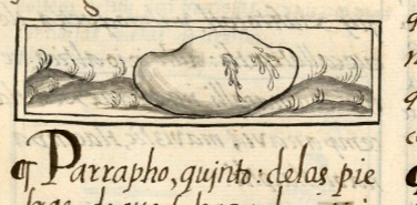 This compound hieroglyph features a bloodstone (eztetl). It is included in this digital collection for the purpose of making comparisons with related hieroglyphs. The term selected for this example comes from the text near the image in the Digital Florentine Codex. There is no gloss, per se. This example shows a stone (tetl) that is shaped like a potato, made three-dimensional with shading, a European artistic innovation for Nahua tlacuilos. The bloodstone, which is called this because of being “mottled like blood” (in the Anderson and Dibble translation), actually shows blood dripping down the outside of the stone in two places rather than having spots. The representation of the blood does not have the stylistics of earlier hieroglyphs of liquids, but looks more like drops of blood that might be drawn by a European artist, such as on a painting of Christ. This is true, too, of the way the general shape of stone appears, very unlike early hieroglyphs of stones, which have wavy diagonal lines and curling ends. Putting the stone in a landscape setting also reflects European artistic influences.