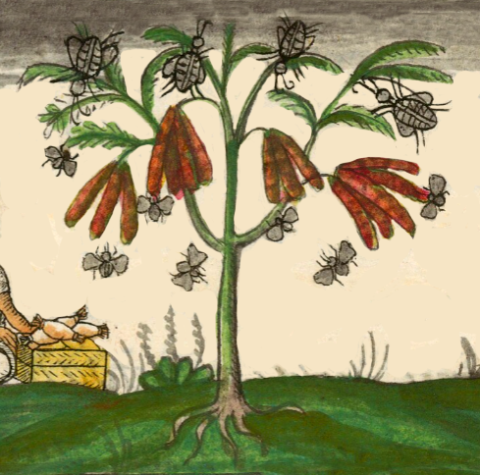 This iconographic example, featuring a huaxin tree, is included in this digital collection for the purpose of making comparisons with related hieroglyphs. The term selected for this example comes from the text near the image in the Digital Florentine Codex. There is no gloss, per se. This example shows a frontal view of the tree with some lacy green leaves and clumps of red pods hanging down. Flies (zayolin) buzz around the pods and other insects appear at the top of the tree. The contextualizing image shows a woman sitting on her legs with a woven, lidded basket (petlacalli) in front of her with some pink objects on top, perhaps tamales. The text explains that the pods are bean-like, and the insides are edible, although they smell bad. The landscape and dark sky are suggestive of European artistic styling that this tlacuilo has embraced, but the tree and its pods are not far away from those seen in the Codex Mendoza from c. 1541. On the next page of the Florentine Codex, the same scene is repeated with modifications. For one thing, women are harvesting the pods and preparing to market them, which correspONDs with the text’s mention of the sale of pods in the tianquiztli. The other development is that the bugs at the top of the tree, which must have been caterpillars (ahuatl), have transformed into butterflies (papalotl). The tree stands in a landscape setting. This setting, along with the shading that provides a three-dimensionality to the scene, reveal European artistic influence.