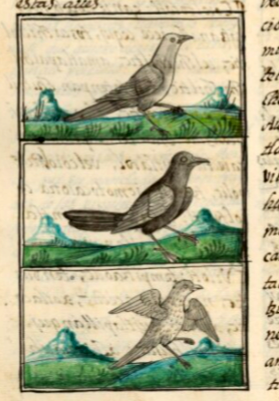 This iconographic example, featuring a mourning dove (huilotl), is included in this digital collection for the purpose of making comparisons with related hieroglyphs. The term selected for this example comes from the Nahuatl text on the same page as the image in the Digital Florentine Codex. There is no gloss, per se. This example shows a ¾ view of a huilotl in flight (showing movement). Its head is turned to the right in a profile view. The mourning dove is set in a landscape that shows European stylistic influences.
