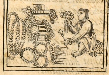 Nahuas adorned their divine forces with flower garlands. Such flowers were also important in ceremonial offerings, served as gifts to guests during feasts, and some were put onto people designated for sacrifice. [See: Frances Berdan, The Aztecs, 2021, 169; Jennifer Kathleen Browder, “Place of the High Painted Walls,” Ph.D. Dissertation, UC Riverside, 2005, 163; Susan Toby Evans and David L. Webster, Archaeology of Ancient Mexico and Central America, 2001, 272; Steven Buchmann, The Reason for Flowers, 2015, 94.] The image on folio 199r shows that men wore the garland across their bodies (over the head and over one shoulder). The crowns went around the head at the height of the forehead, and they were tied at the back with flowers trailing down to the height of their shoulders. In one hieroglyph in this collection, Tocpacxochiuh (“Our Flower Crown”) is a Nahua man’s personal name (see below). Other hieroglyphs show flower garlands that are part of various semantic compositions. For example, the iconographic example of the tlahuanqui (drunk man), shows him wearing flowers on his head, even if his is not quite a garland or crown of flowers.
