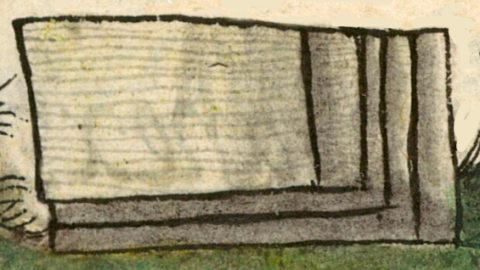 This iconographic example, featuring a group of palm leaf fiber cloaks (iczotilmatli), is included in this digital collection for the purpose of making comparisons with related hieroglyphs. The term selected for this example comes from the text near the image in the Digital Florentine Codex. There is no gloss, per se. This example shows a frontal view of a stack of five rectangular palm leaf fiber cloaks in different sizes. Horizontal lines suggest that these are woven fibers. Shading shows three-dimensionality, suggesting European artistic influence. In the contextualizing image, a man with a pack on his back is walking toward the stack of tilmas.