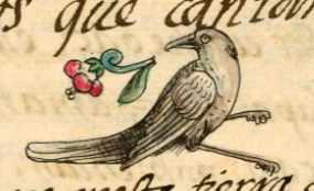 This iconographic example, featuring a song bird that can chirp or warble (the verb ihicahuaca), is included in this digital collection for the purpose of making comparisons with related hieroglyphs of words and songs. The term selected for this example comes from our Online Nahuatl Dictionary. There is no gloss, per se, and this term is not found in the text surrounding the image. This iconographic example involves a cuitlacochin bird emitting a large, turquoise blue speech scroll with a red flower attached to it. The flower has a green base, a stem, and a single leaf. The companion text praises this bird as a huel cuicani (fine singer).