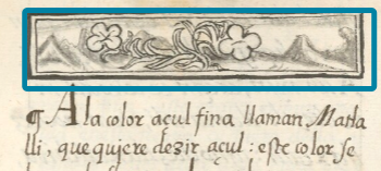 This iconographic example, featuring a blue flower (matlalin), is included in this digital collection for the purpose of making comparisons with related hieroglyphs. The term selected for this example comes from the text near the image in the Digital Florentine Codex. There is no gloss, per se. It is not unusual that this term is spelled matlali, with the final “n” having dropped away. This example shows a black-line drawing of a four-petalled flower that has an X-shape where the four petals join in the middle. The flower is attached to a low-growing herb with long, curving leaves that have a line down the middle of the length. The landscape setting shows European artistic influence.