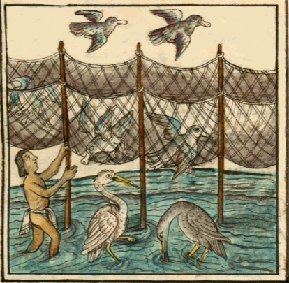 Nahuatl hieroglyphs and other iconographic examples show much smaller nets, as a rule, for the purpose of catching fish. But here, the nets are large, and they are suspended in the air.