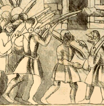 Because these are Spanish firearms, it might not be surprising that these are the first harquebuses to enter this digital collection as of February 2026, when the database has over 7500 records. When the Nahuas set out to attack and defeat an opponent prior to the Spanish invasion, they used hand-held combat weapons and they set fire to the opponent’s temple. See the example of a defeat (tepehualiztli) below. As is typical of this manuscript, the setting is a landscape that involves three-dimensional shading (learned from European artists). The context is a ruling palace, with its signature circular designs below the roofline.