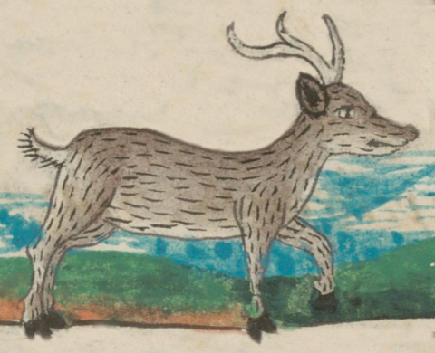 This iconographic example, featuring a deer (mazatl), is included in this digital collection for the purpose of making comparisons with related hieroglyphs. The term selected for this example comes from the text near the image in the Digital Florentine Codex. There is no gloss, per se. This example shows a profile of deer in the countryside, walking toward the viewer’s right. It has antlers and a mottled gray coat. Its belly is white. The use of grounding shows European artistic influence on the Nahua painter.