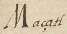 The mazatl was a day name in the 260-day religious divinatory calendar called the tonalpohualli (count of the days), and so it appears as a personal name in the Matrícula de Huexotzinco and other manuscripts. The deer is often depicted by a head only, and it typically shows antlers. The presentation of antlers in the Codex Mendoza is more stylized; a deer shown in the DFC, Book 11, Folio 16r (not yet in this collection), has antlers more like those in the Codex Mendoza. When mazatl is shown as a date in the calendar, it is accompanied by a number from one to thirteen.
