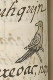 This iconographic example, featuring a common house finch (molotl), is included in this digital collection for the purpose of making comparisons with related hieroglyphs. The term selected for this example comes from the Nahuatl text near the image in the Digital Florentine Codex. There is no gloss, per se. This example shows a bird that is nearly caught in the binding, which results in some distortion of the painting. It is shown in profile, with the body turned toward the viewer’s right, and its head is turned back to the left. It is light brown in color.