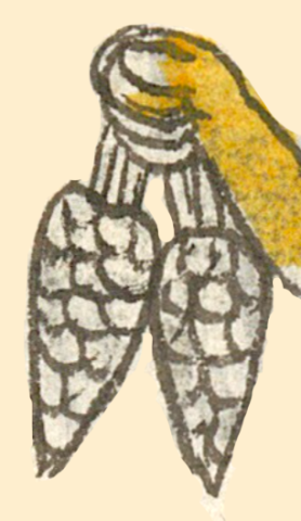 This iconographic example, featuring two maize ears tied together (ocholli), is included in this digital collection for the purpose of making comparisons with related hieroglyphs. The term selected for this example comes from the text near the image in the Digital Florentine Codex. There is no gloss, per se. This example shows two husked ears of corn, tied at the top. The contextualizing image shows a woman making this offering to the divine or sacred force of Xipe Totec. This was a time in the religious holiday when human skins from sacrificial victims were removed and thrown in a cave. Totec stands near the woman; he is an unusually large, nude figure, perhaps representing the ixiptlatl who would have already discarded the outer skin (a type of regeneration). With the term ocholli, the emphasis is on the bunch, and it can apply to different kinds of food. The cobs here (two of them) have their kernels exposed. Whether these are fresh/green (xilotl), ready to eat (elotl), or dried (olotl, whether the cob is full or empty, or as a counting term for individual kernels) is difficult to say.