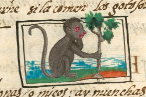 This iconographic example, featuring a monkey (ozomatli), is included in this digital collection for the purpose of making comparisons with related hieroglyphs. The term selected for this example comes from the text near the image in the Digital Florentine Codex. There is no gloss, per se. This example shows a profile view of a dark gray ozomatli, facing the viewer’s right. Its left hand goes up to the facial cheek that is not visible. Its right hand grabs onto a nearby tree. It is sitting on some grass. Its tail rises and curls at the end. The monkey’s face shows dark pink eyes, mouth, and nose. The hair on its head sweeps forward. Here, it is an animal in a landscape, showing European artistic influence.