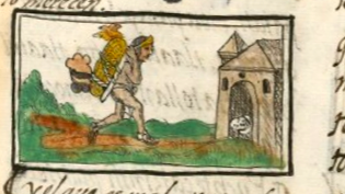 This iconographic example, featuring an imperial vanguard merchant (oztomecatl), is included in this digital collection for the purpose of making comparisons with related hieroglyphs. The term selected for this example comes from the text on the same page in the Digital Florentine Codex. There is no gloss, per se. This example shows a vanguard merchant in profile, facing right, and still in the act of walking, with his legs far apart. He has apparently walked along the winding road that disappears off in the distance behind him. He carries a large load on a frame (cacaxtli) made for such a purpose. The bundle is covered with a woven mat (petlatl), and its contents are not visible. It is tied with ropes or cords to the wooden frame of the cacaxtli. A bird with wings spread stands upon the top of the bundle. On the lower end of the bundle there is a large vertical stone, with curling ends and diagonal stripes, alternating tan and black or dark brown. Perhaps the bird (tototl) and stone (tetl) are a remnant of hieroglyphic writing, or perhaps the stone says something about the contents or the weight of the bundle. The man wears a white loincloth (maxtlatl) and white sandals (cactli). His right hand holds the wood at the top of the pack frame. The contextualizing image shows that this oztomecatl is arriving at a building with a European architectural style. Curiously, a man (friar? enslaved person?) seems to be lying inside the entrance, on his side, facing outward.