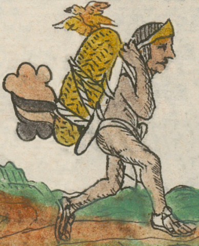 The Oztomeca were known as merchants who kept secrets and hid things. [See Samuel Salinas Álvarez, Historia de los caminos de Mexico, t. 1 (1994), 88.] They were helping to advance the empire with their spying. A fair number of oztomecatl glyphs appear in this digital collection. Three of them (as of September 2025) show men carrying packs. One shows two stones, suggesting an association of stone perhaps with the place name Oztoman (“Like a Cave”) that once gave the merchants their label. Two show a special, decorated staff that may have had an association with the status of being a vanguard merchant. One has a design that is not identifiable.