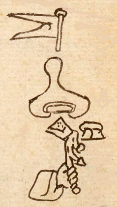 This compound Nahuatl hieroglyph is a black-line drawing of the place name Patlachiuhcan. With six elements, it is an especially large compound. These elements start with a swallowtail flag (pamitl) flying left and having a cap at the top of the post. This flag is the phonetic indicator that the name starts with Pa-. Moving downward, the next element is a hill or mountain (tepetl) that narrows in the middle. This may be a semantic indicator that the compound represents a place name that has the locative -can (where). If the tepetl combines with the water (lower down) to create altepetl (town or city-state), that would also suffice to cover the -can semantically. Two front teeth (tlantli) stand for the -tla- syllable. The ear of corn and the hand with the water may provide for semantic meaning of chihua (to make or do), as in to perform agricultural work. The water (atl) could also provide a complementary -a- syllable, given that the vowel appears three times in the place name.