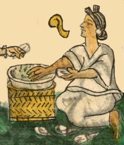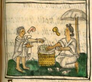 This iconographic example, featuring tobacco leaves (picietl), is included in this digital collection for the purpose of making comparisons with related hieroglyphs. The term selected for this example comes from the Nahuatl text near the image in the Digital Florentine Codex. There is no gloss, per se. This example shows a basketful of some gray matter that is for sale. That these are tobacco leaves is suggested by the few leaves that have fallen onto the grass below the basket. Also, the contextualizing image shows a man holding what may be a leaf in his hand. This man is the purchaser. A woman is the vendor, even though Anderson and Dibble used male pronouns write about this salesperson. So many market vendors are, in fact, women, and their prominent role is diminished by the regular use of male pronouns in the translation text. The Nahuatl term for tobacco seller (picienamacac) is not gendered. The text is interesting to read for the physical effects of tobacco smoking, including making one “drunk,” dispelling fatigue, and aiding in digestion.